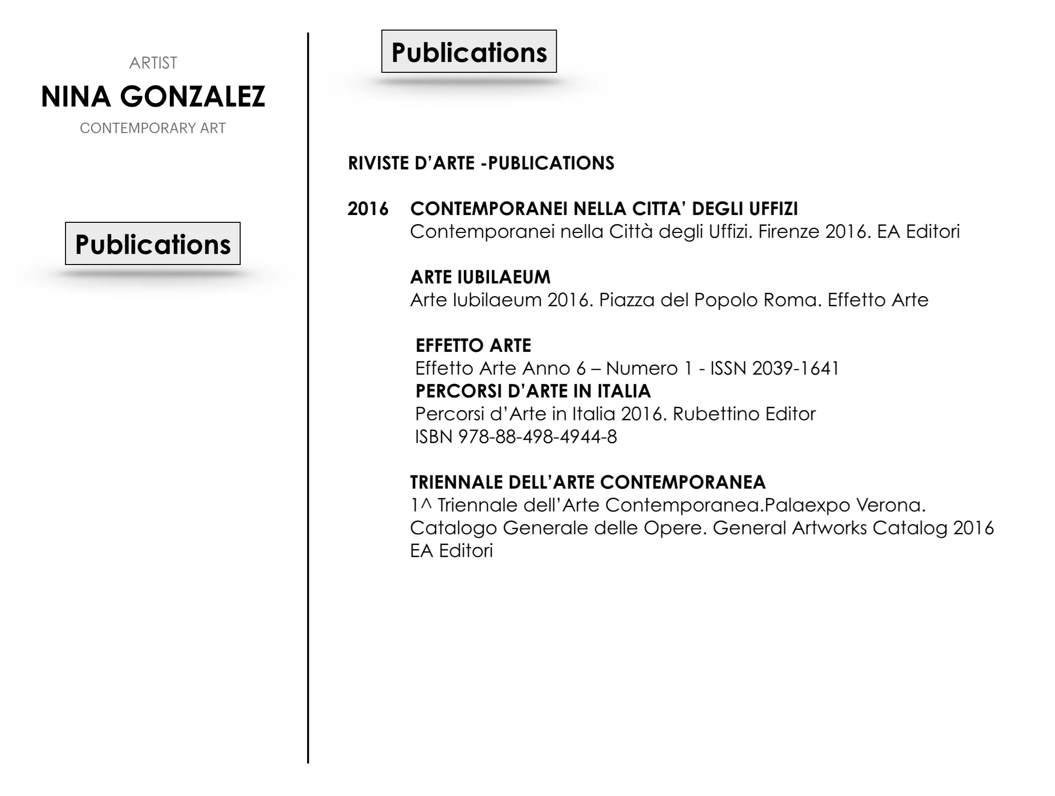 NINA GONZALEZ nata in Colombia nazionalizzata in Italia, vive e opera a New York.